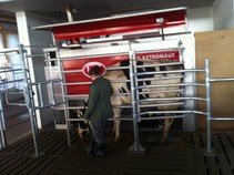 2013 die Inbetriebnahme: Ein neues Zeitalter für uns und unsere Tiere. Im Bild zu sehen ist die erste Kuh im Roboter.